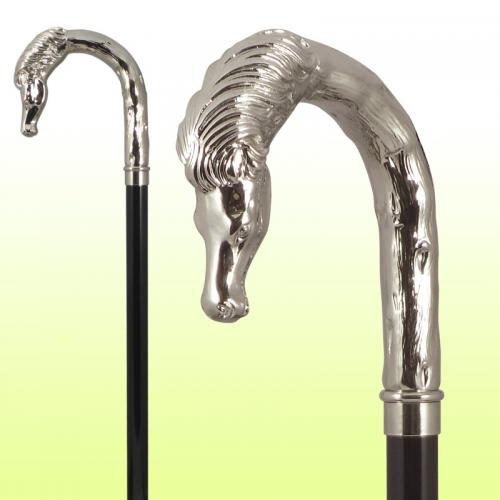 【No.80HO ニッケルメッキホース大曲 ステッキ】 イタリア直輸入、馬の頭の形状をしたユニークなメッキ大曲ハンドルを使ったステッキです。