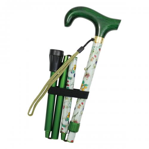 可愛い木の実柄とメタリックアルミのツートンデザインが魅力で人気の高いダービー型ハンドル四つ折りアルミステッキです。