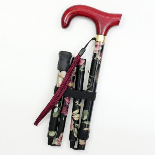 大輪の花を描いたデザインが魅力のダービー型ハンドル四つ折りアルミステッキ。