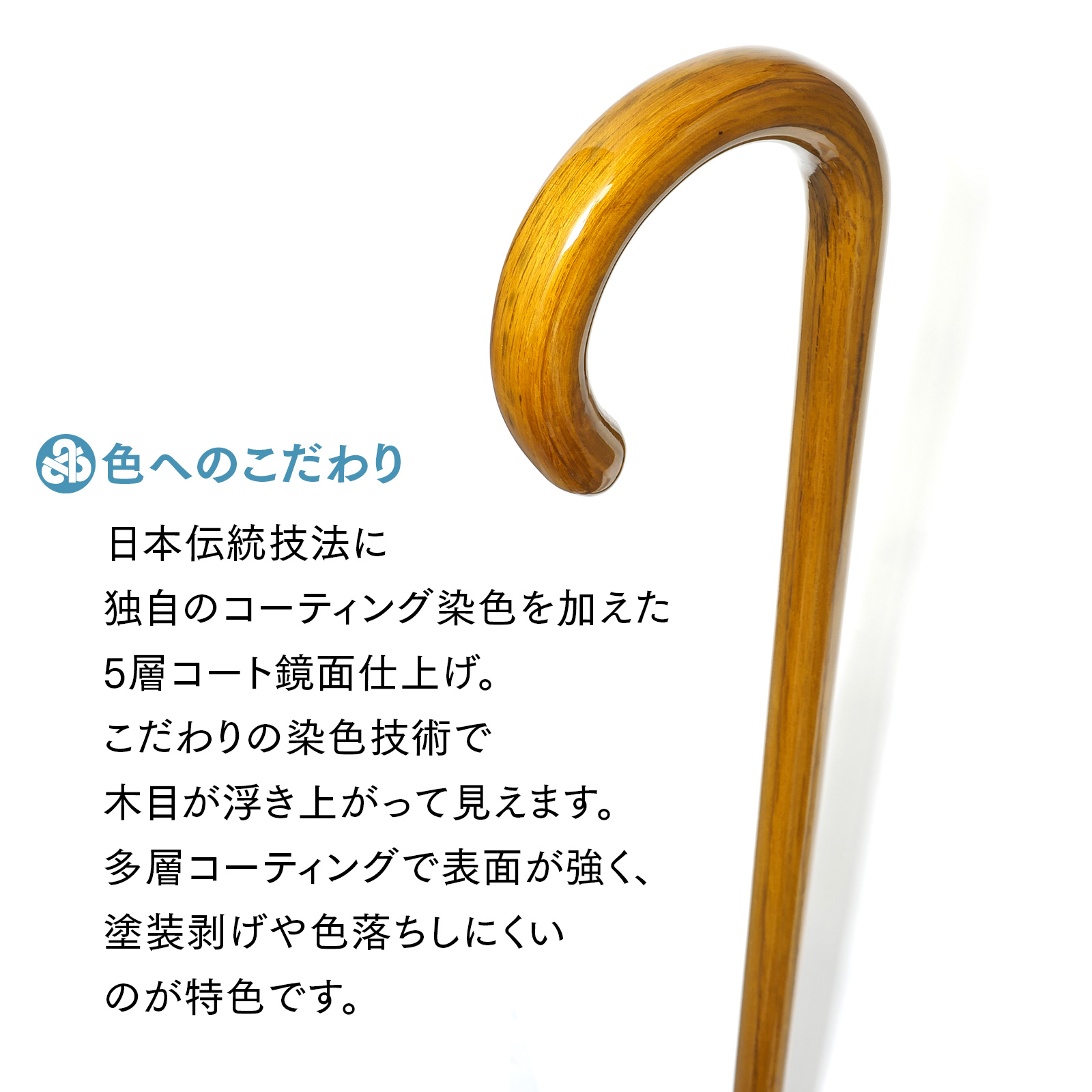 ファッションステッキとしても重宝されていた「大曲」スタイルのステッキに現代の技術を加え、色・木目を綺麗に表現しました。