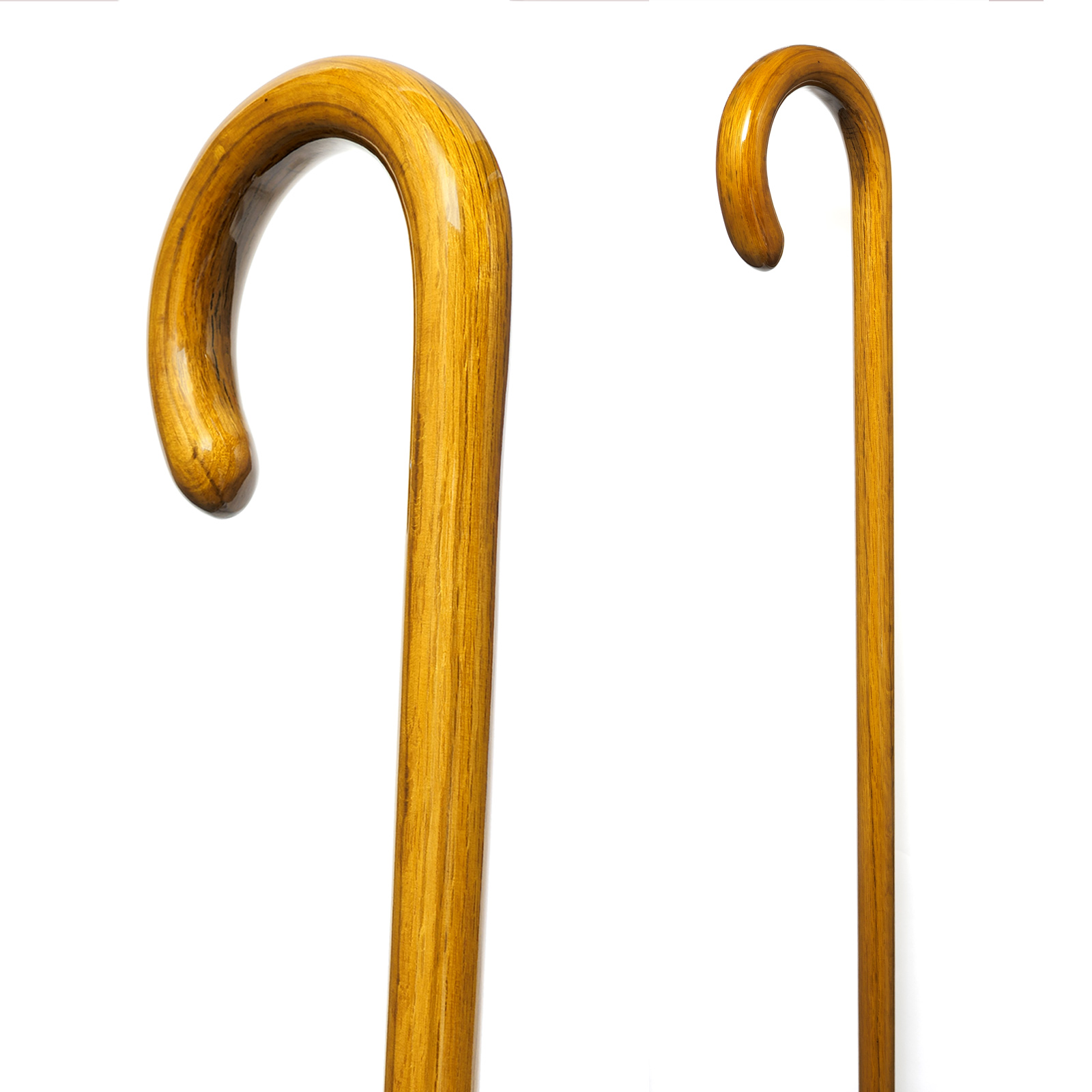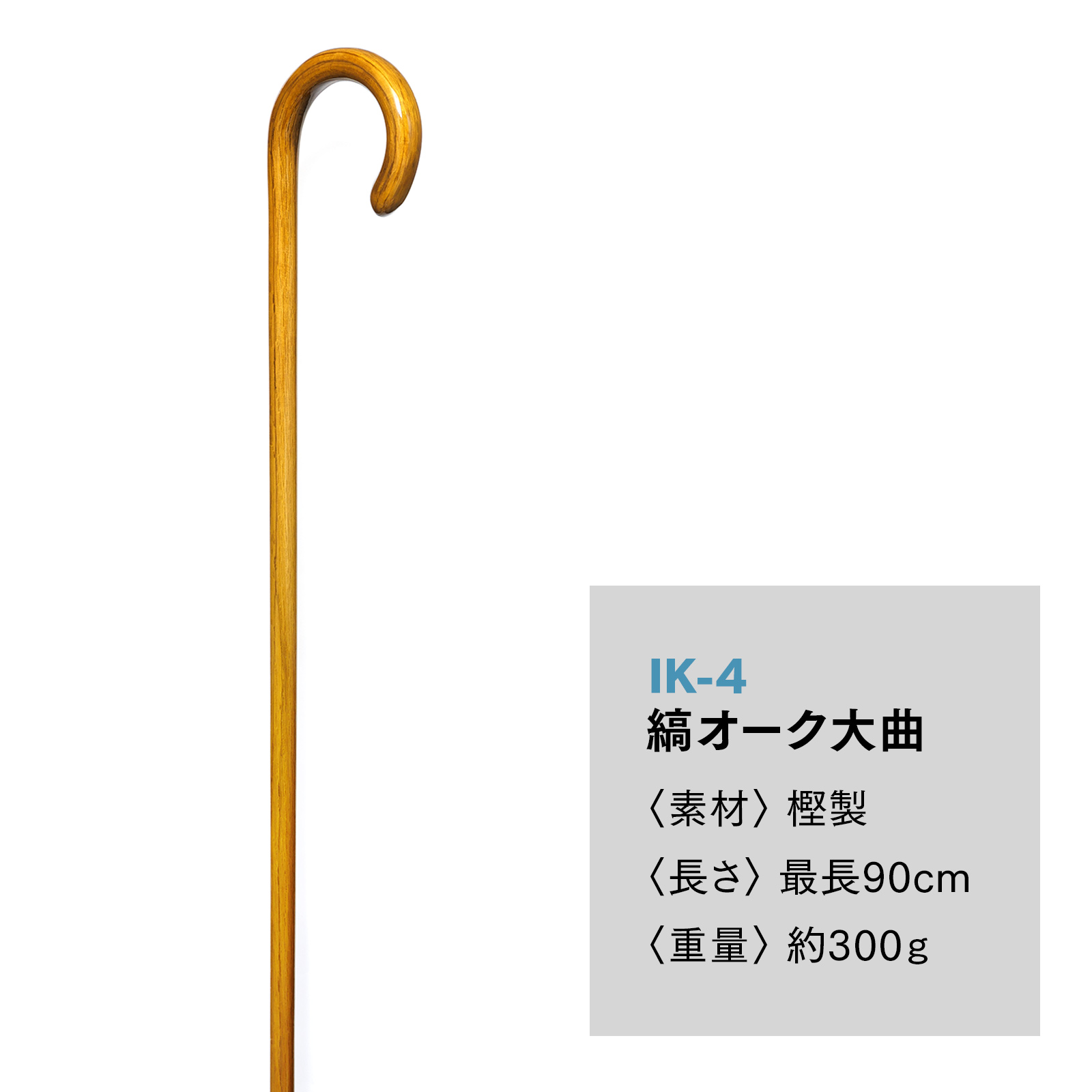 明るい色合いと木目が特長的な、縞オークの大曲ステッキ。