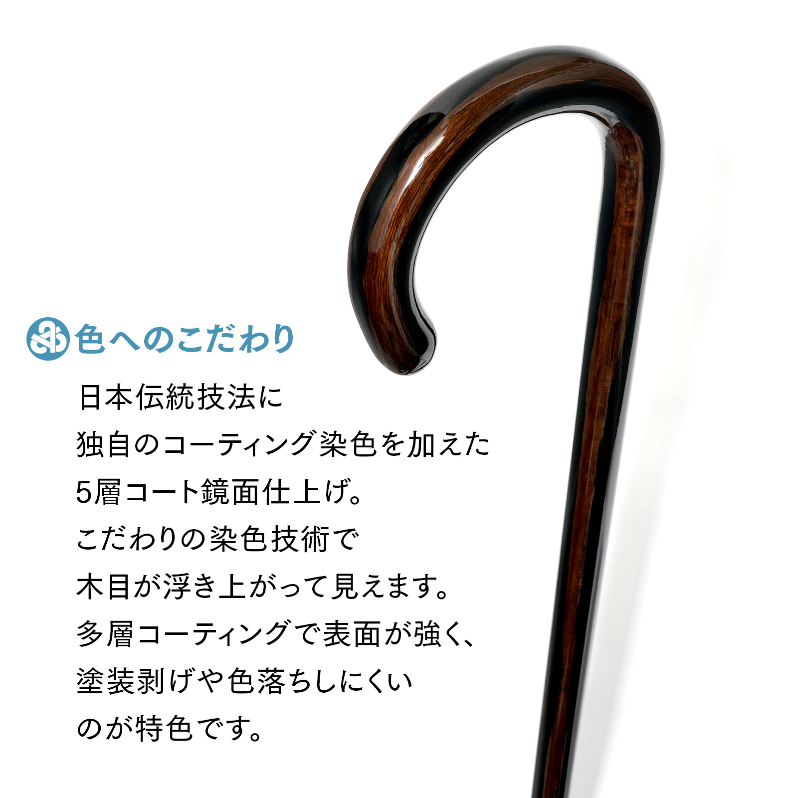 ファッションステッキとしても重宝されていた「大曲」スタイルのステッキに現代の技術を加え、色・木目を綺麗に表現しました。