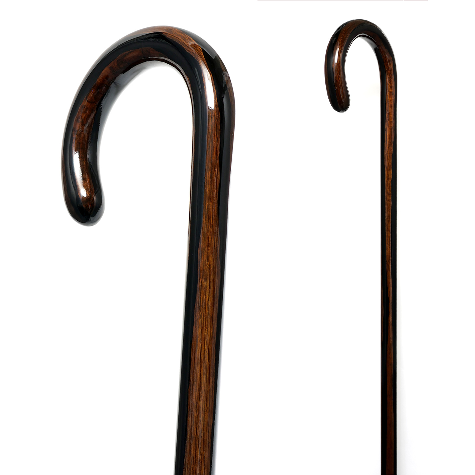 樫の大曲に黒檀調の塗装を施した、美麗で印象的なデザインの大曲ステッキ。