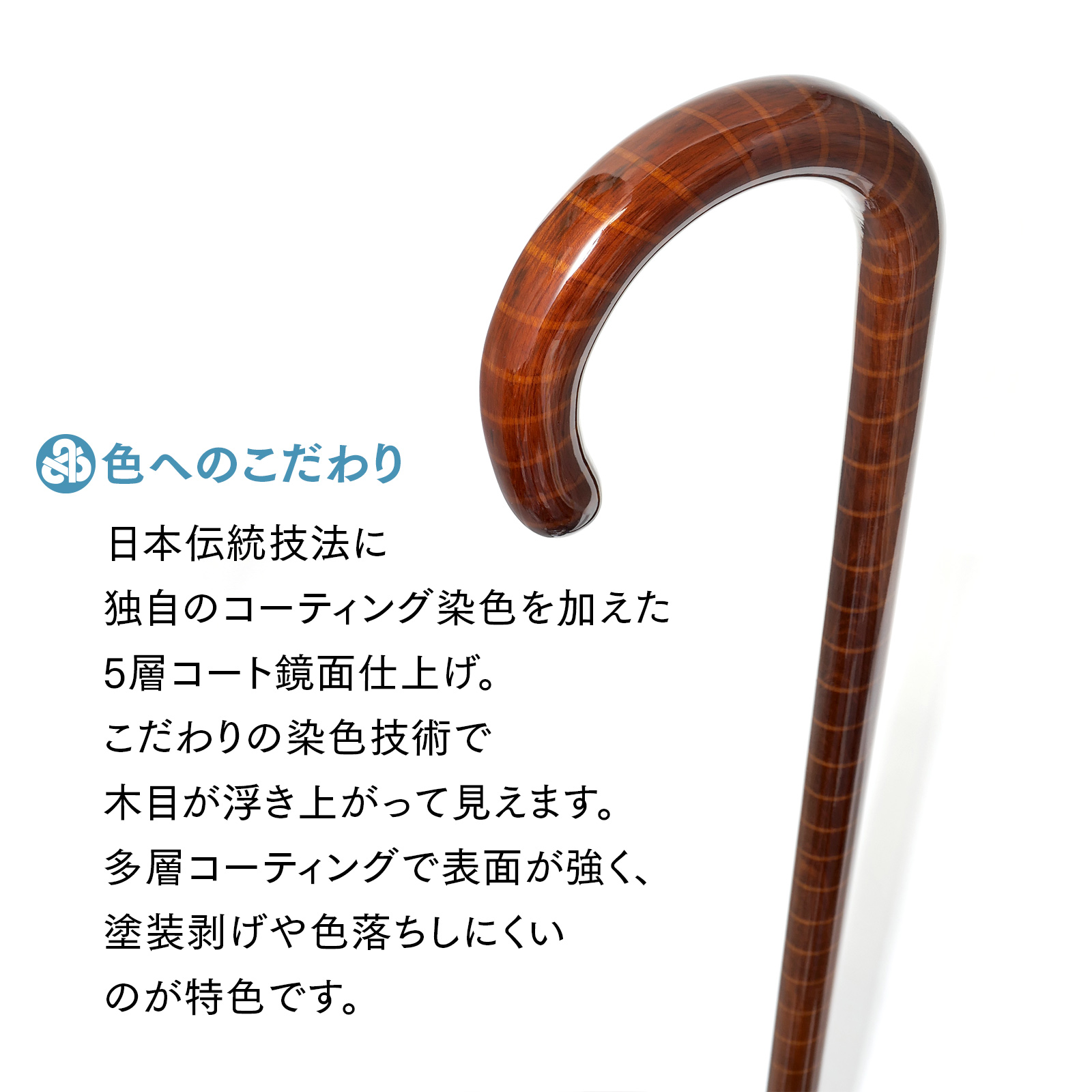 ファッションステッキとしても重宝されていた「大曲」スタイルのステッキに現代の技術を加え、色・木目を綺麗に表現しました。