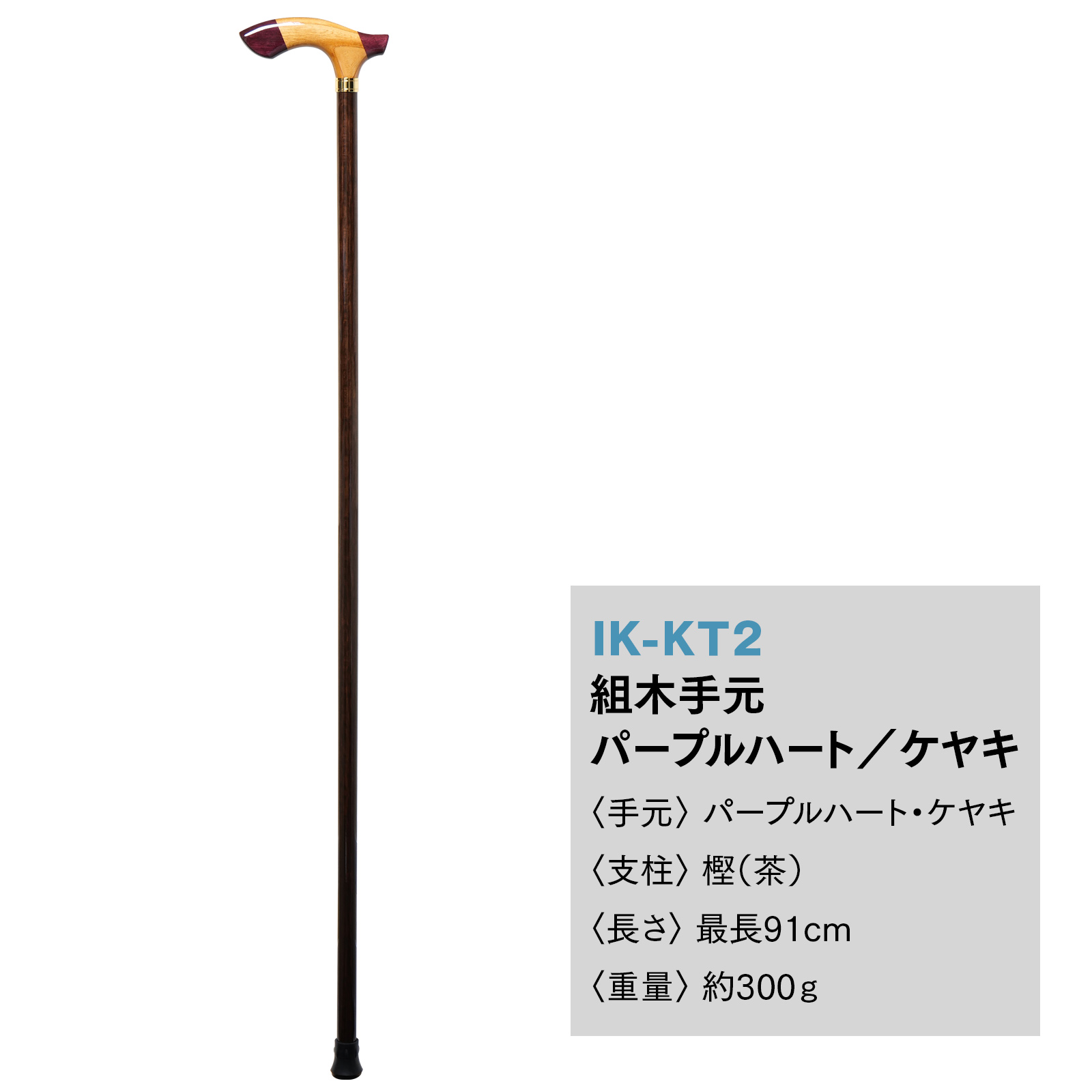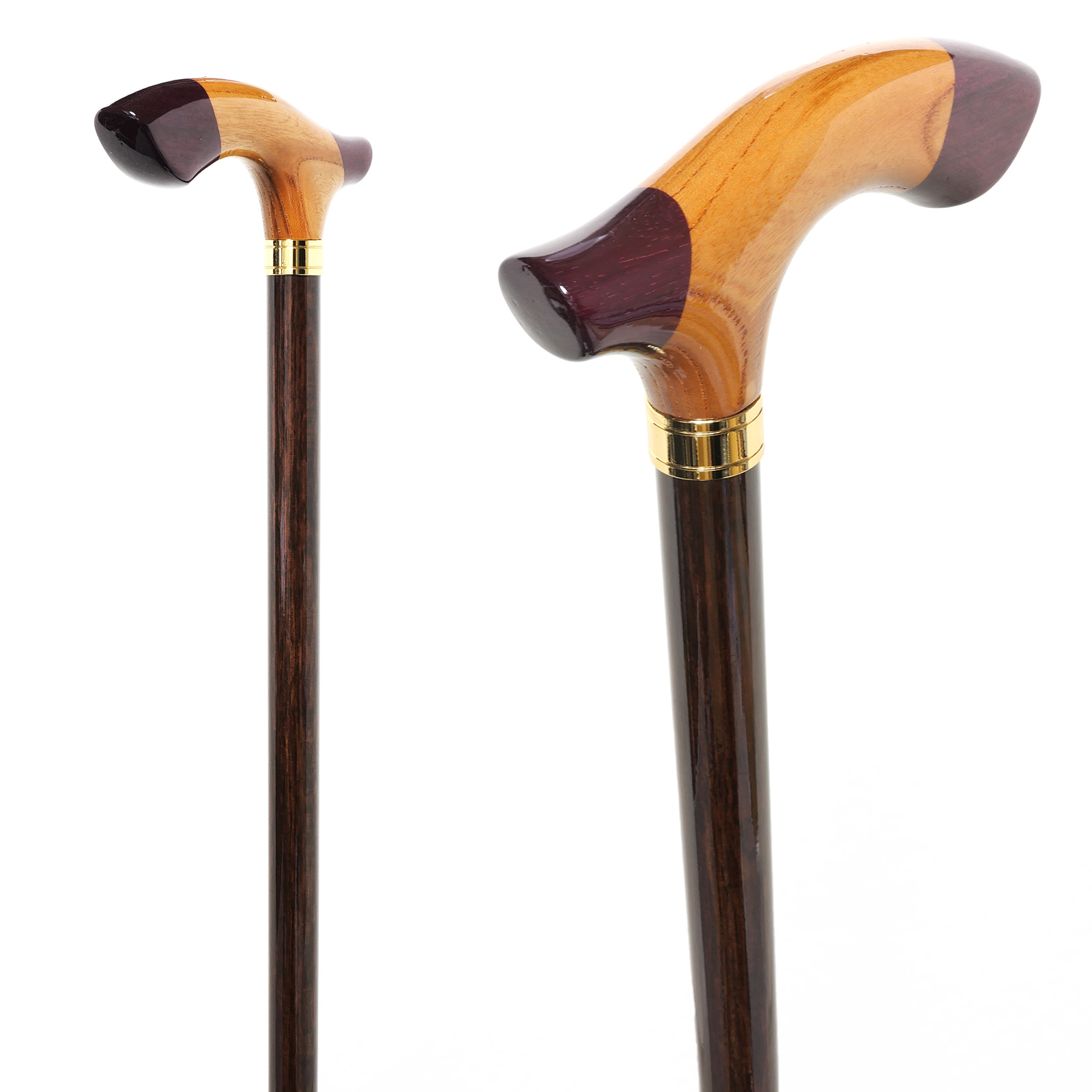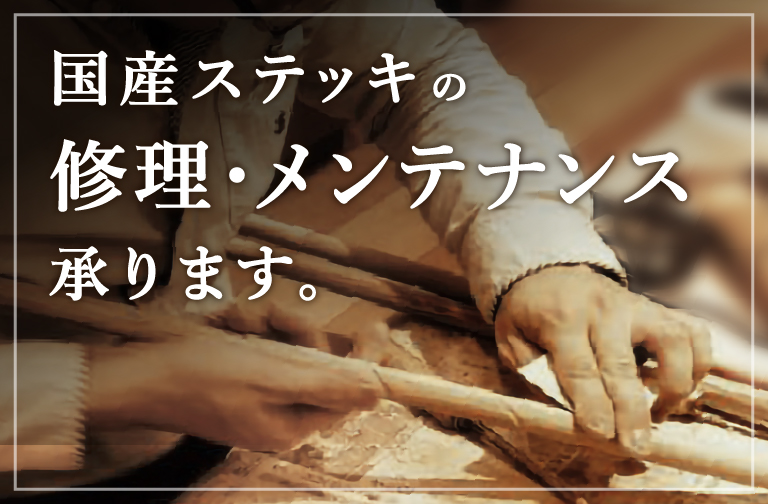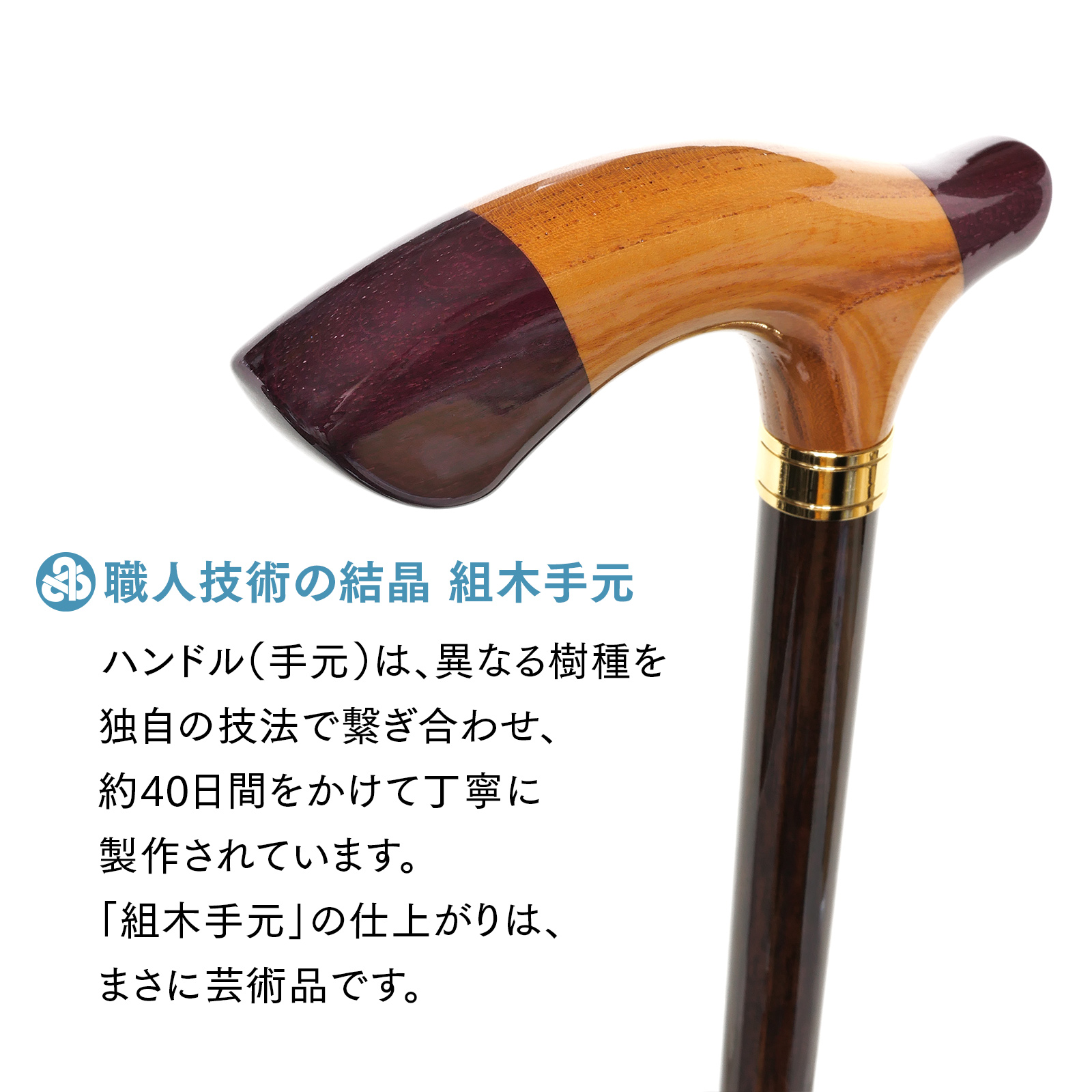 このステッキのハンドル(手元)は、異なる樹種を独自の技法で繋ぎ合わせた「組木手元」。