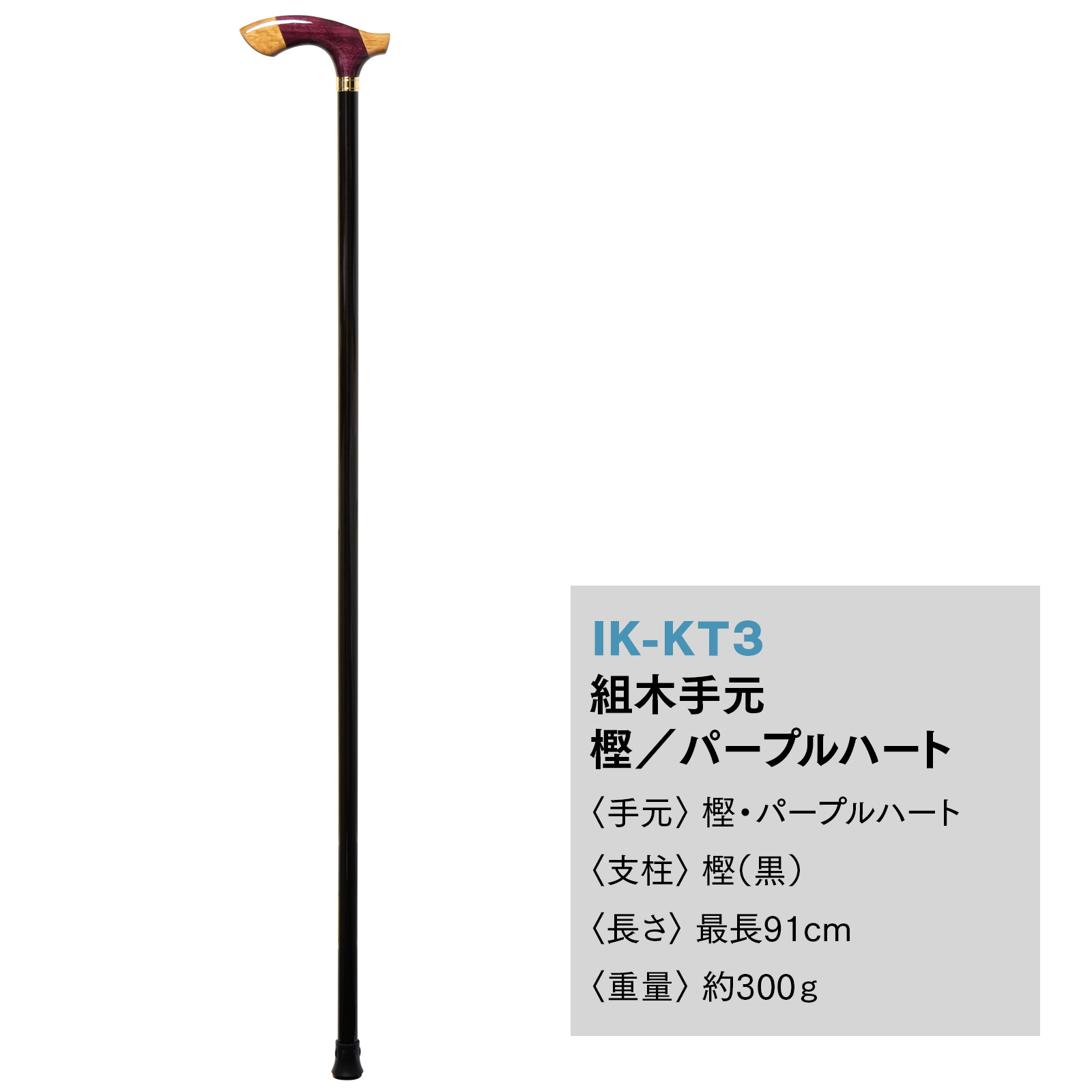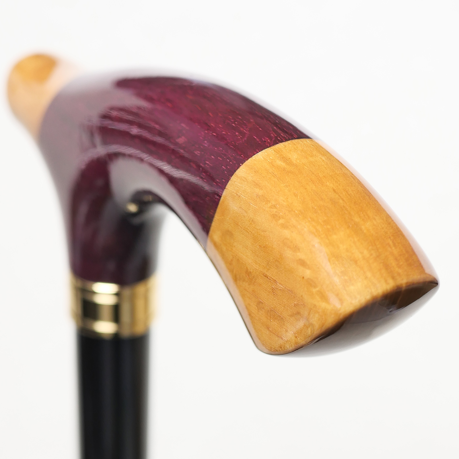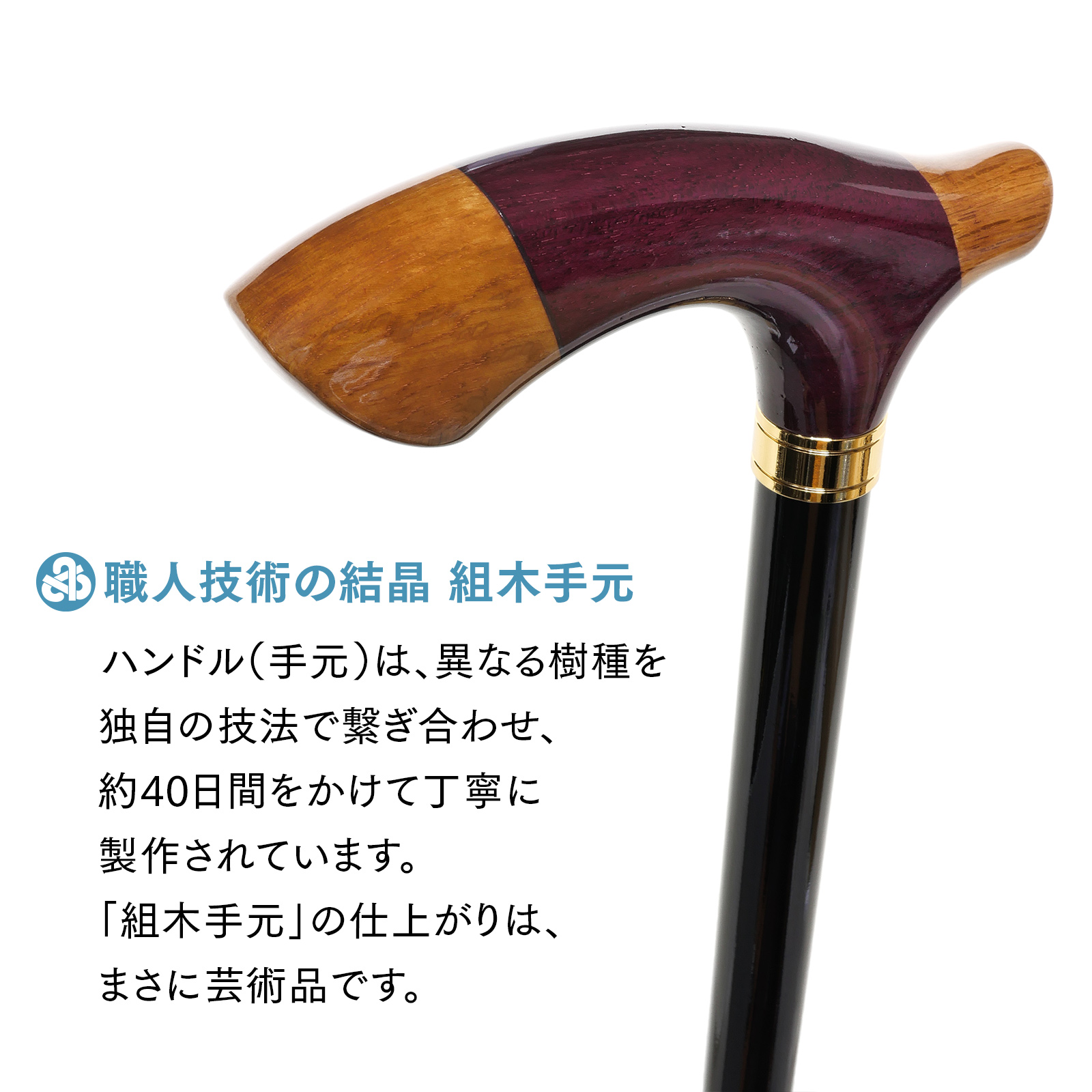 このステッキのハンドル(手元)は、異なる樹種を独自の技法で繋ぎ合わせた「組木手元」。