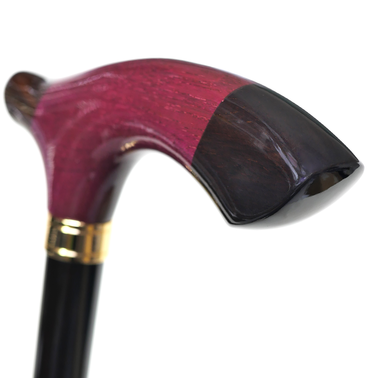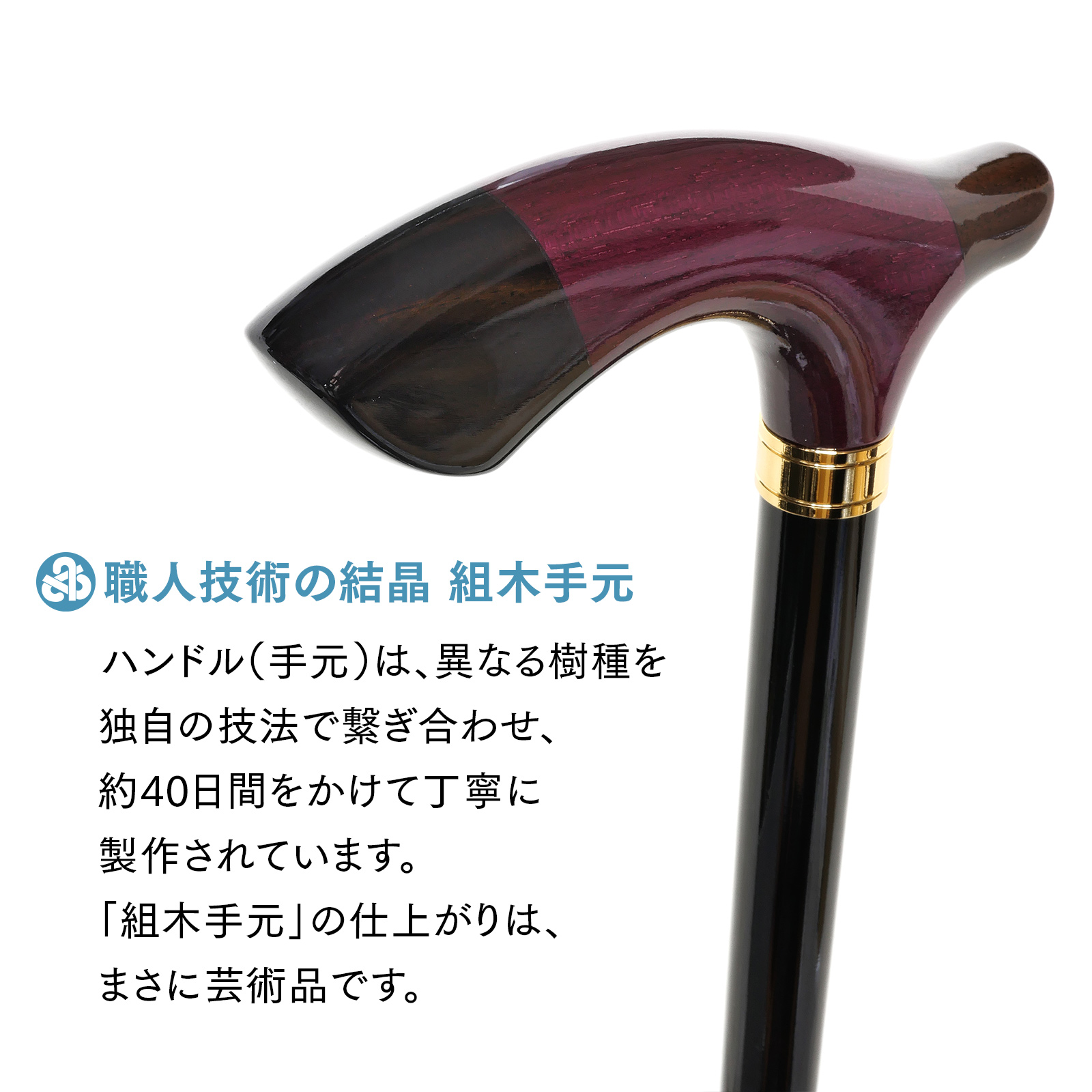 このステッキのハンドル(手元)は、異なる樹種を独自の技法で繋ぎ合わせた「組木手元」。