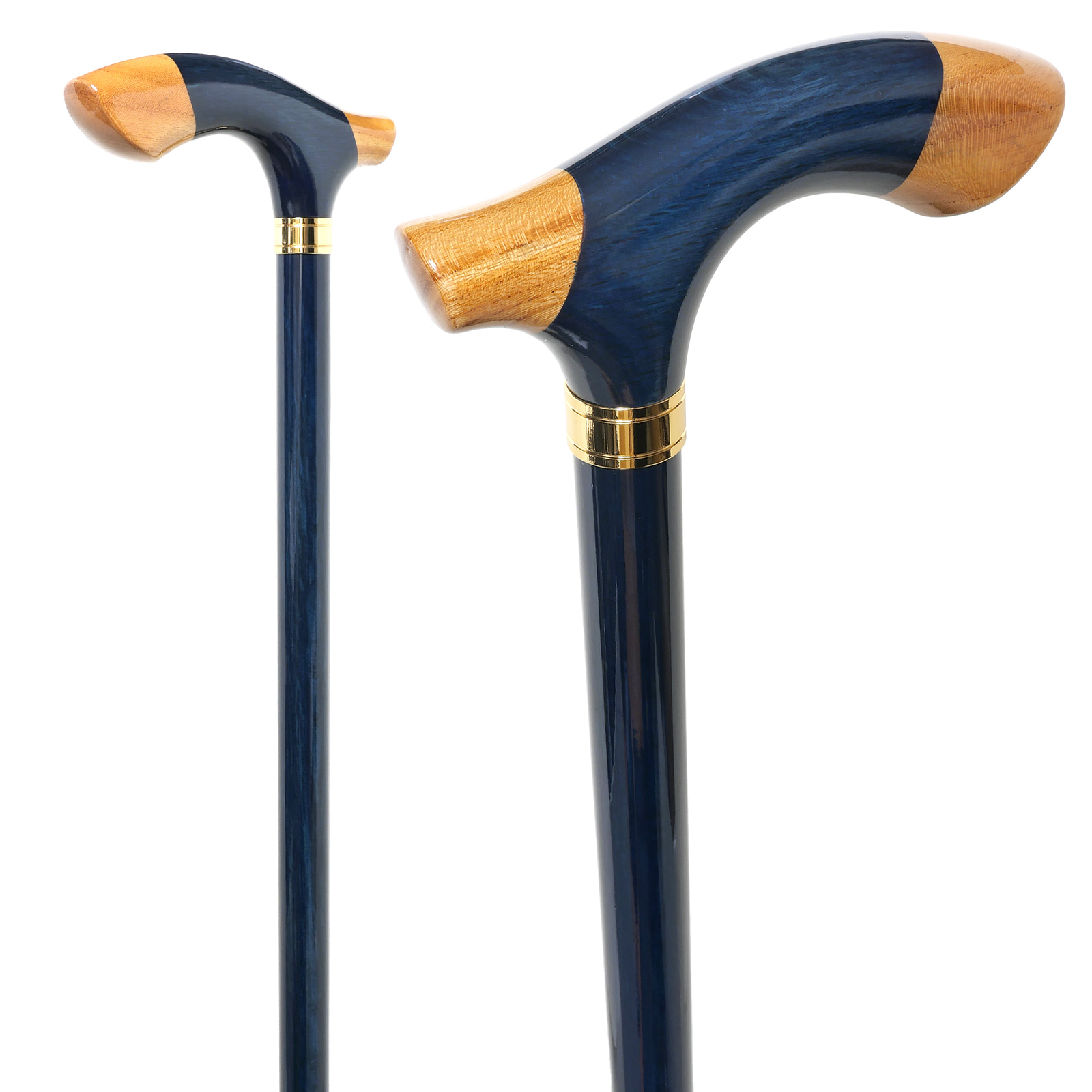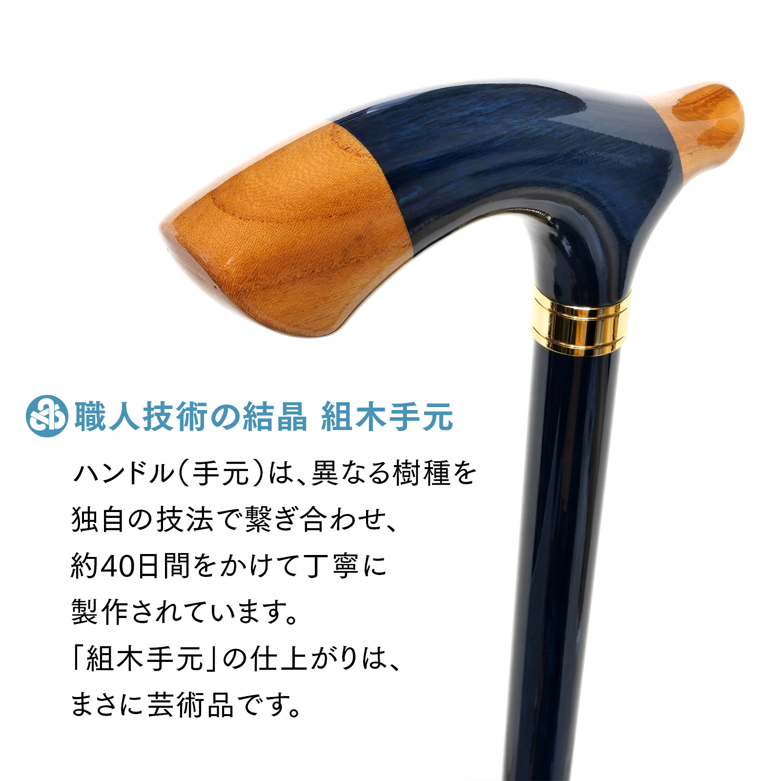 このステッキのハンドル(手元)は、異なる樹種を独自の技法で繋ぎ合わせた「組木手元」。