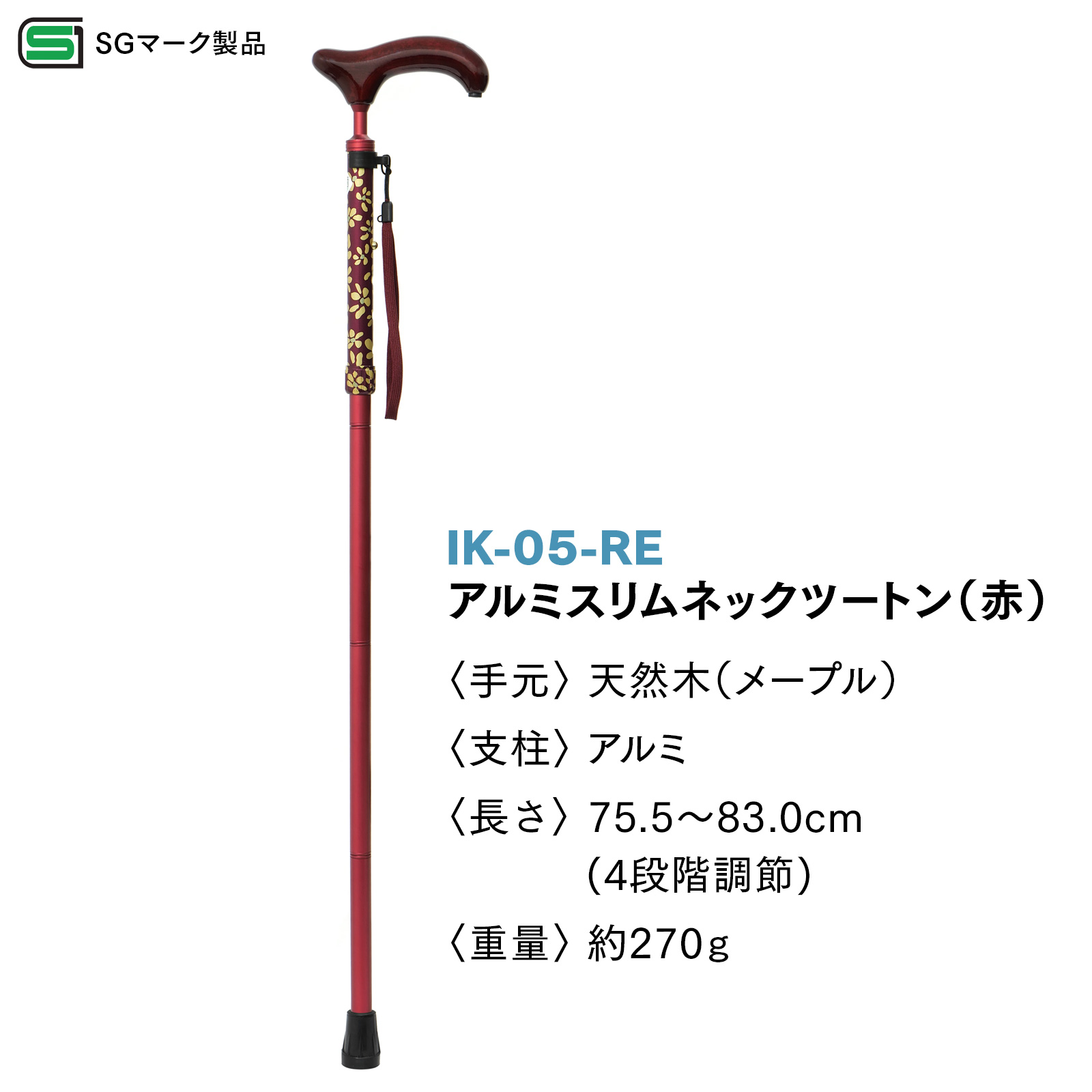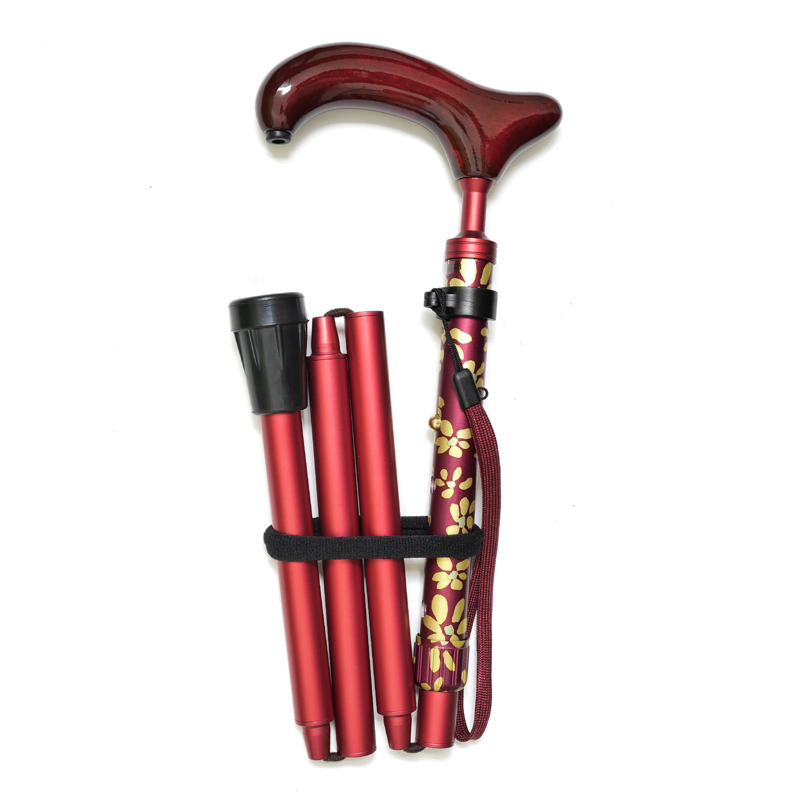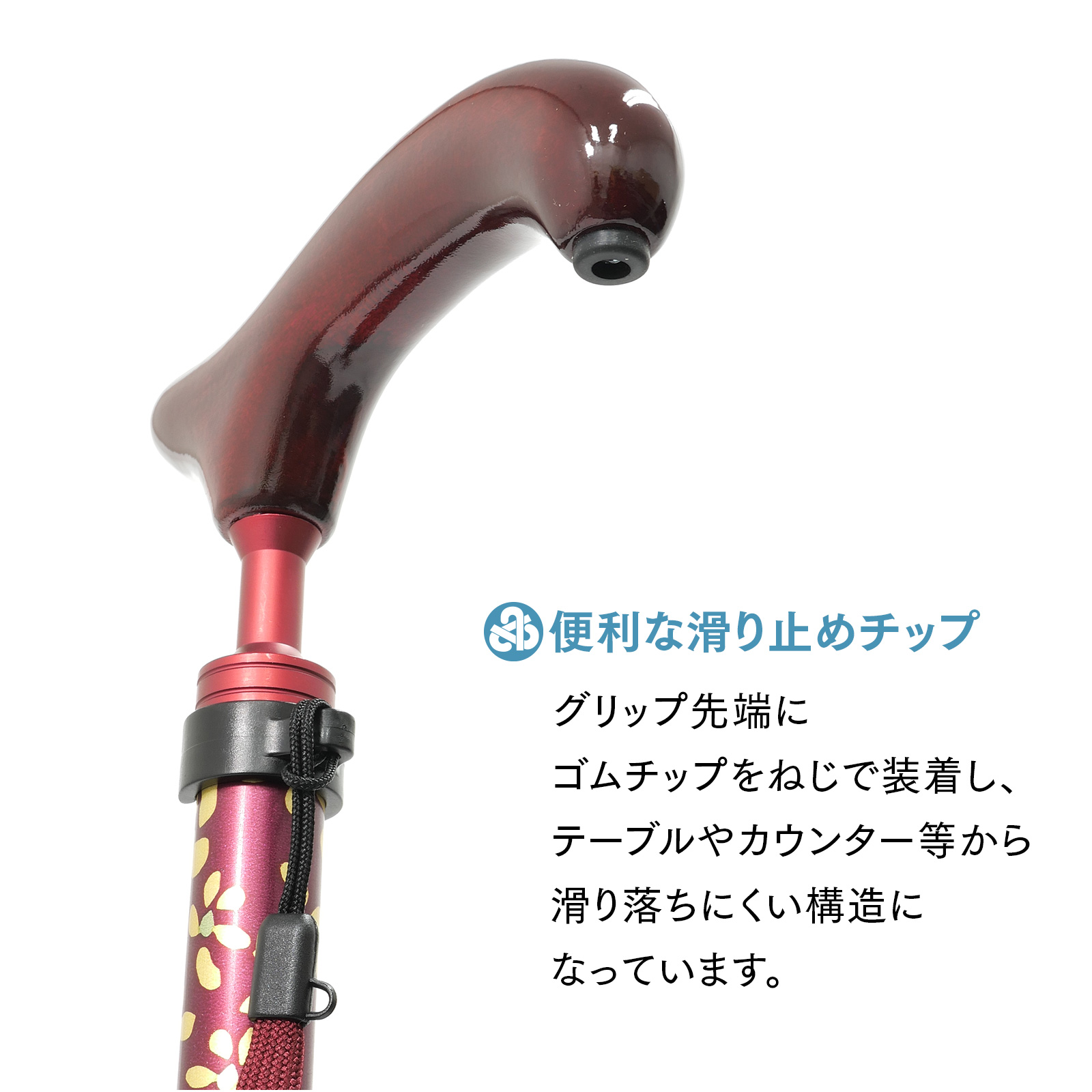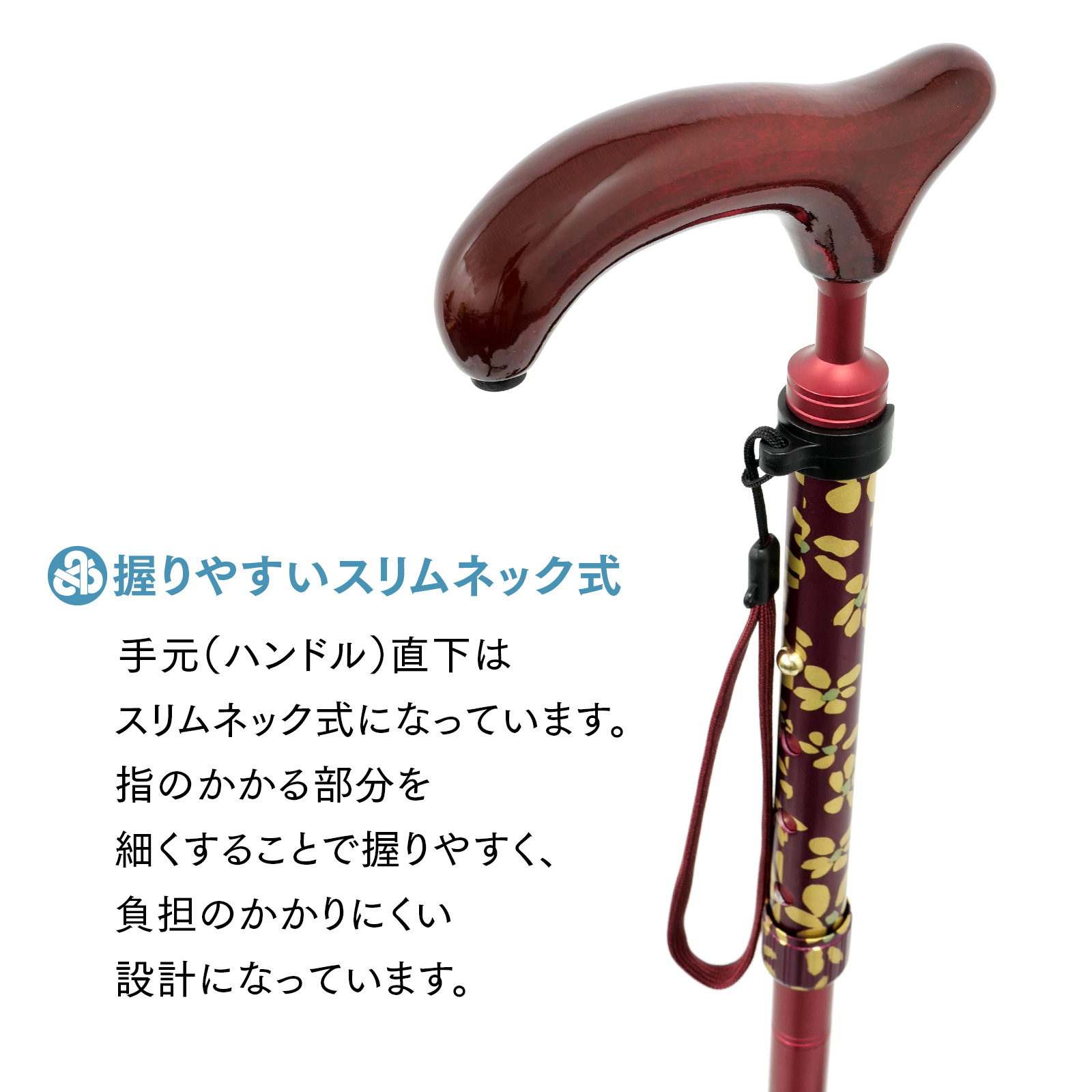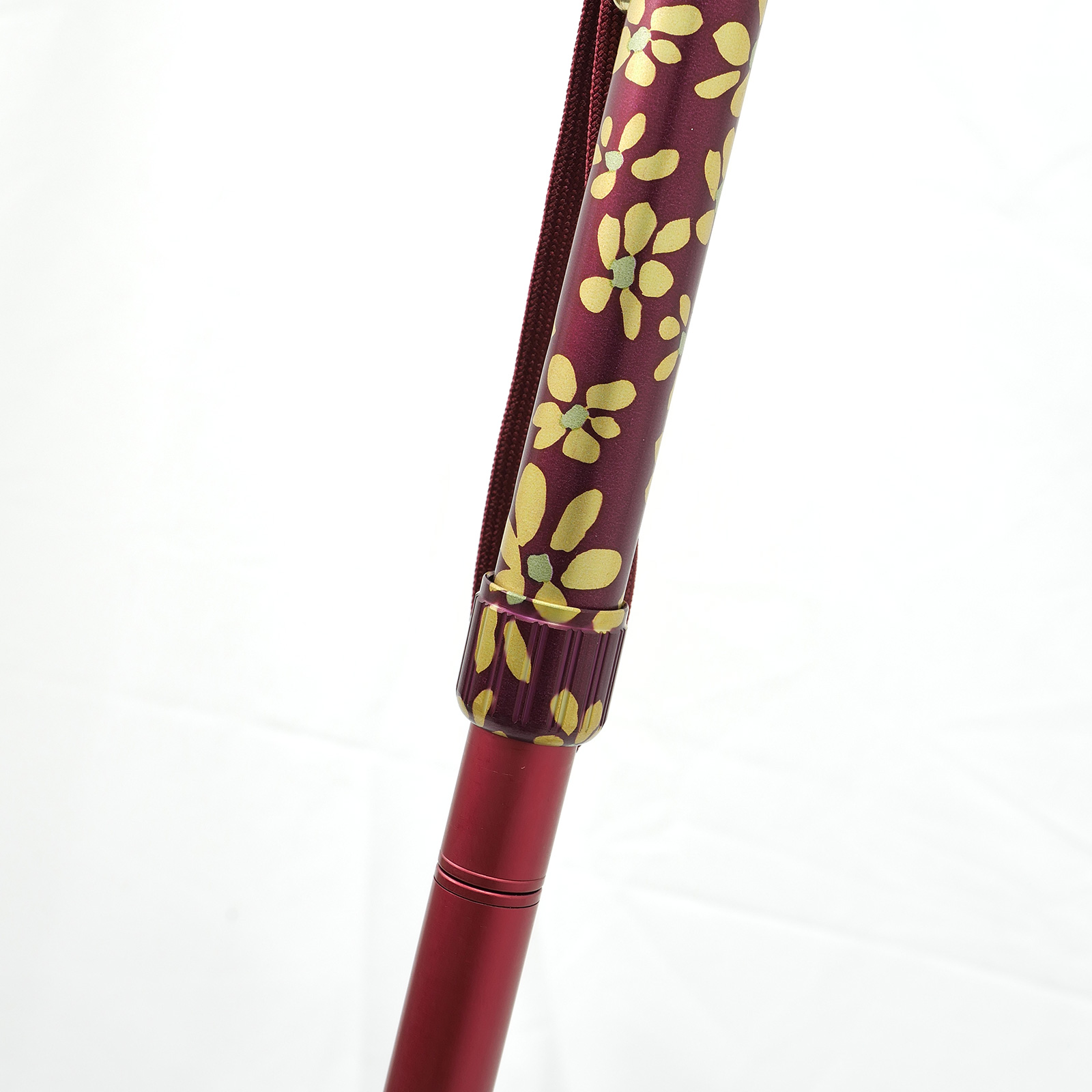 赤を基調とした、シンプルで上品な花柄デザインに仕上げた4つ折タイプのアルミ折りたたみステッキです。