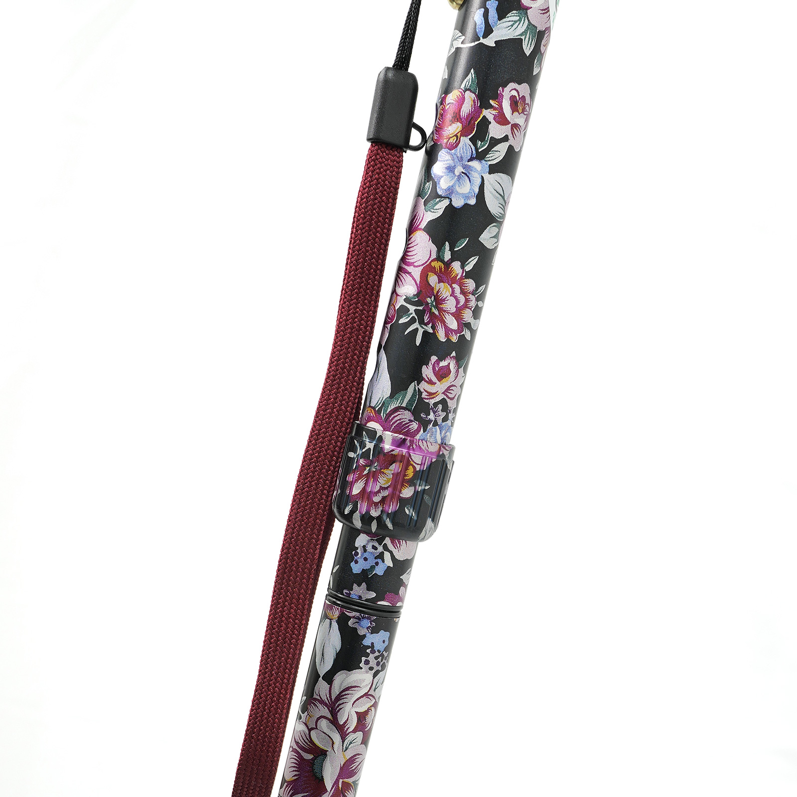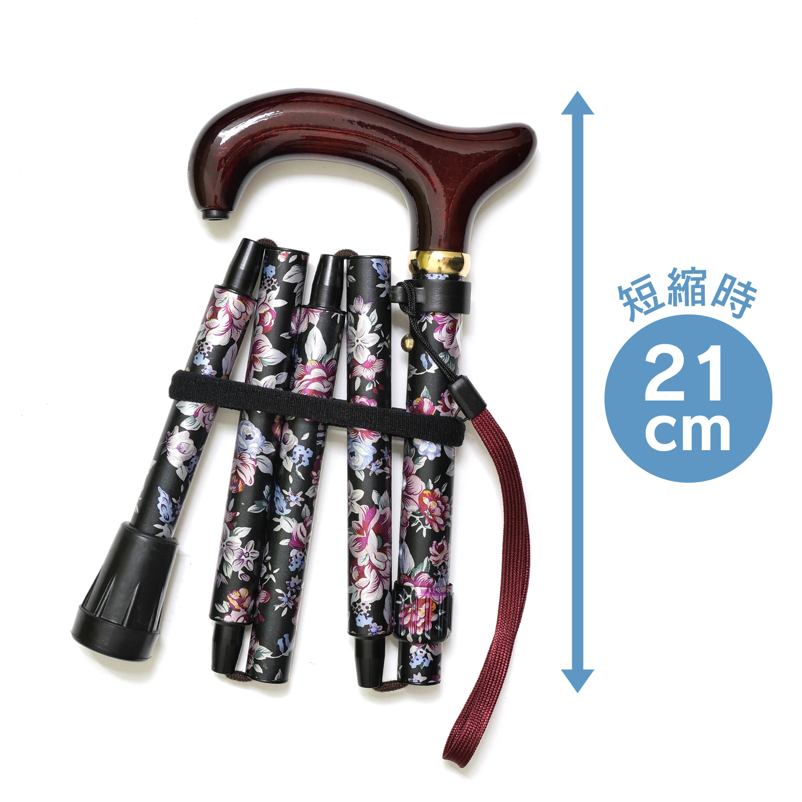 黒を基調とした、美しい花柄デザインに仕上げた5段折タイプのアルミ折りたたみステッキです。