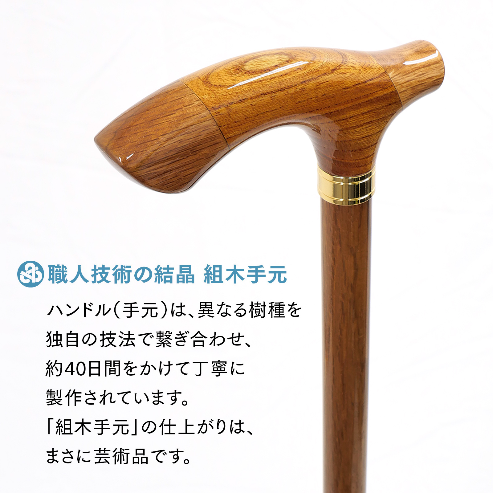 このステッキのハンドル(手元)は、異なる樹種を独自の技法で繋ぎ合わせた「組木手元」。
