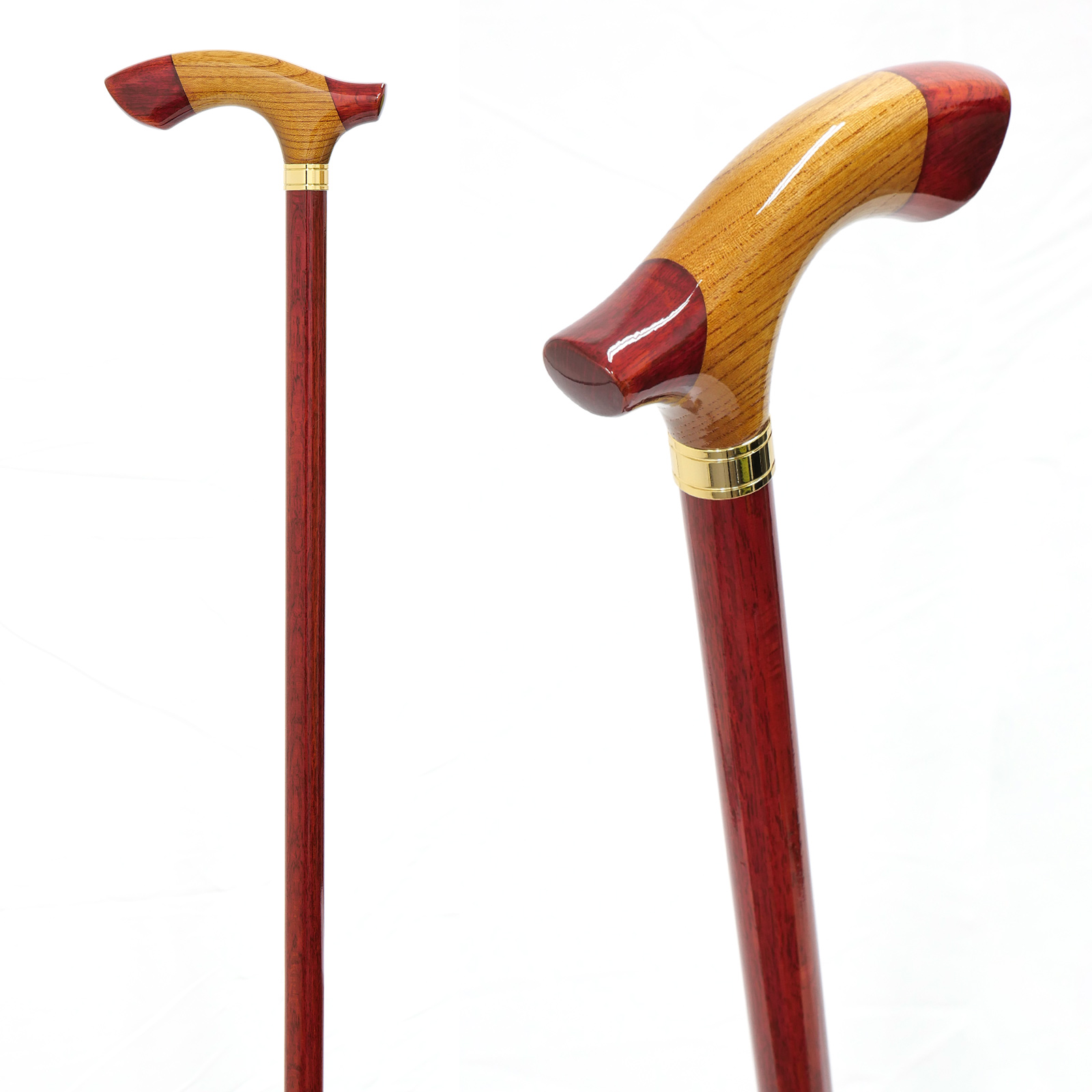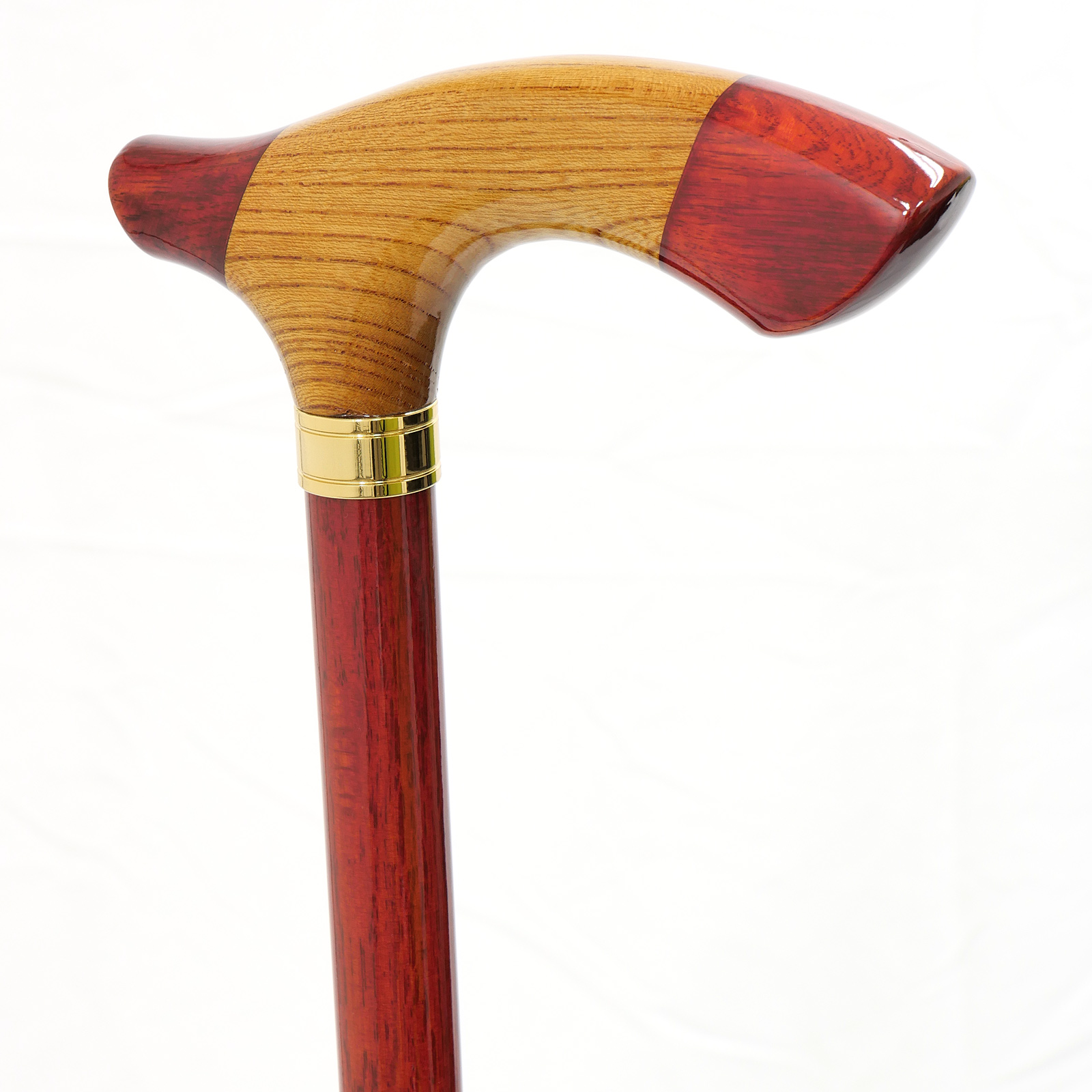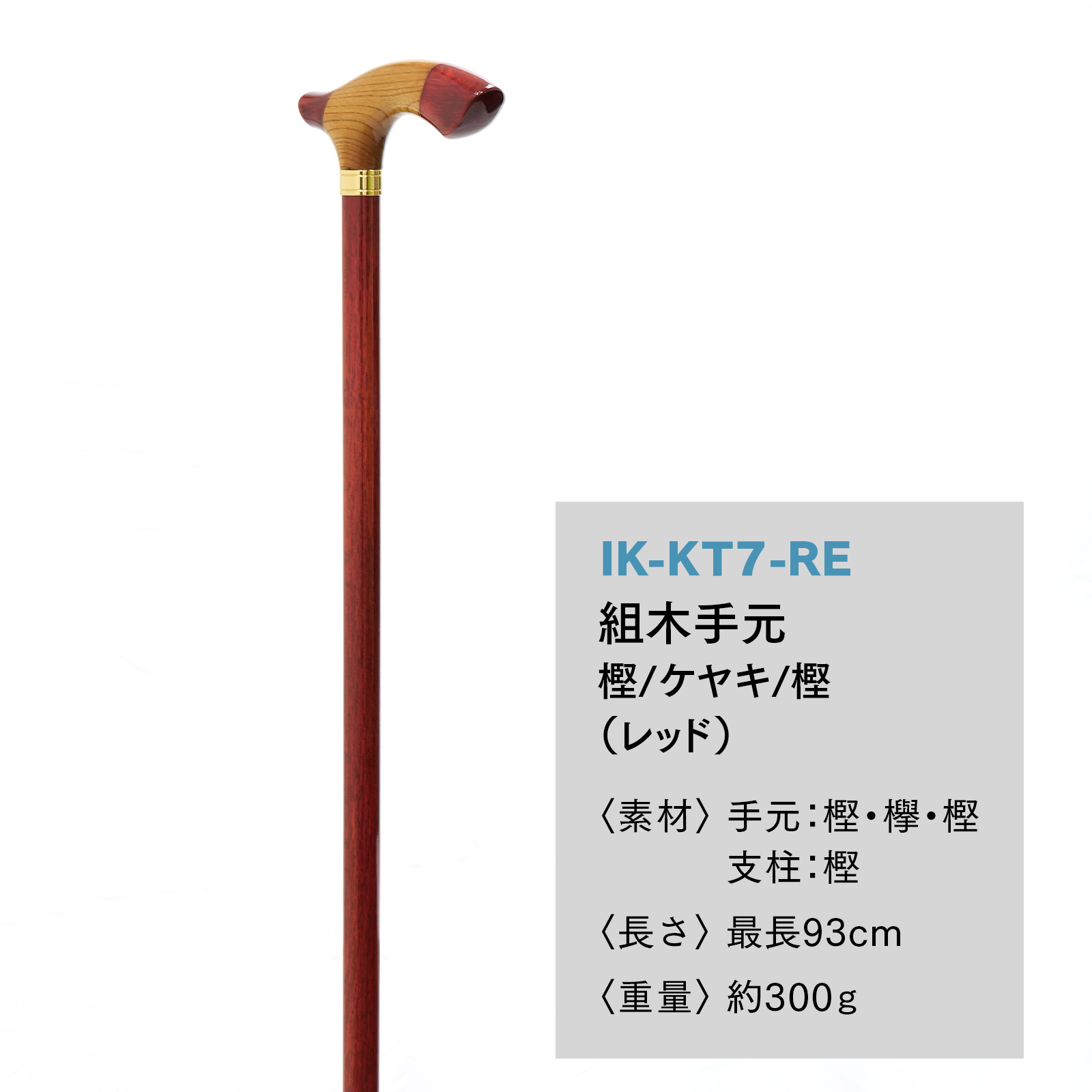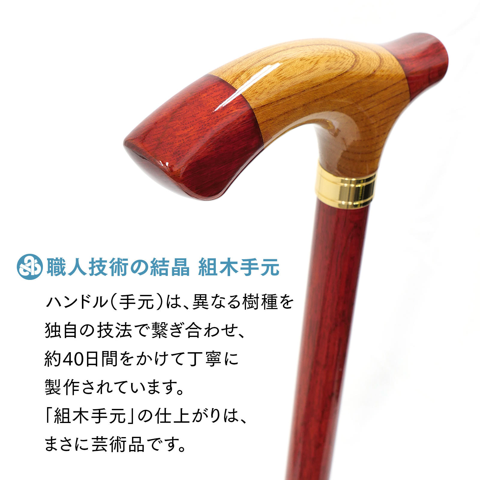 このステッキのハンドル(手元)は、異なる樹種を独自の技法で繋ぎ合わせた「組木手元」。