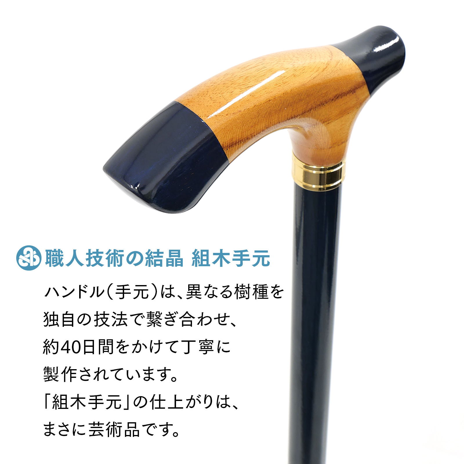 このステッキのハンドル(手元)は、異なる樹種を独自の技法で繋ぎ合わせた「組木手元」。